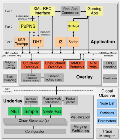 - Applications: Several overlay applications like a DHT, Internet Indirection Infrastructure (i3), Scribe, SimMud, P2PNS and several test applications (KBRTestApp, DHTTestApp, and SimpleGameClient) are implemented.